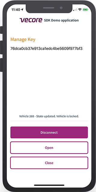 VecoreSDK.sharedInstance.connect(privateManageKey: "123abc456def789ghi987ihg654fed4321") { (vehicleID: Int, connectionStatus: VecoreConnectionStatus) in